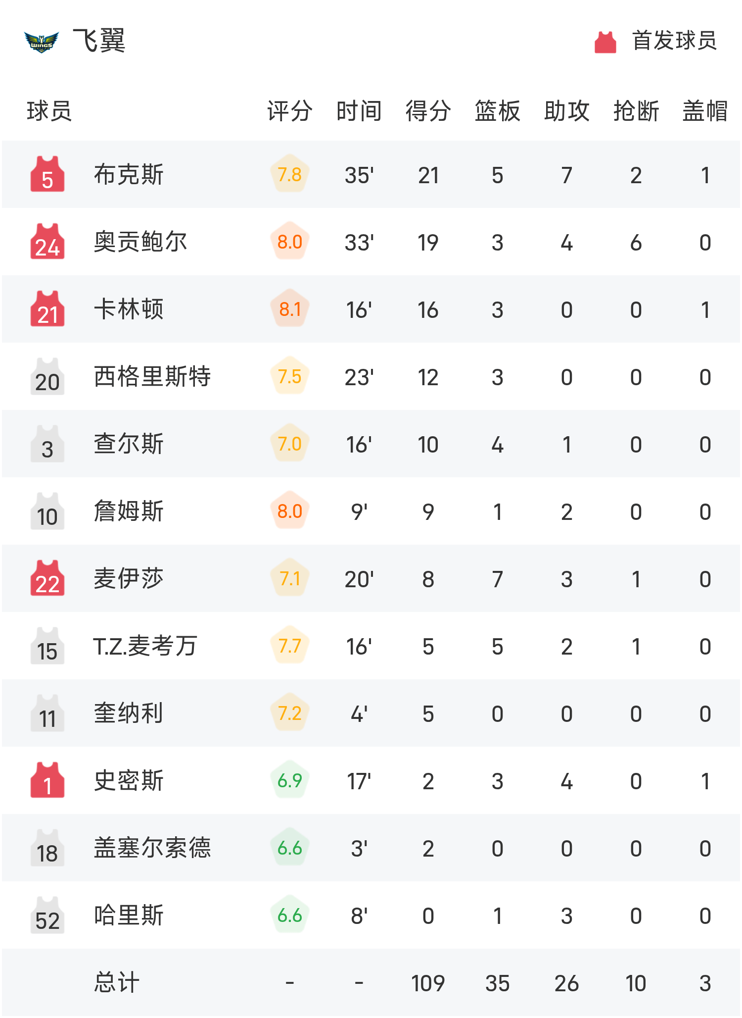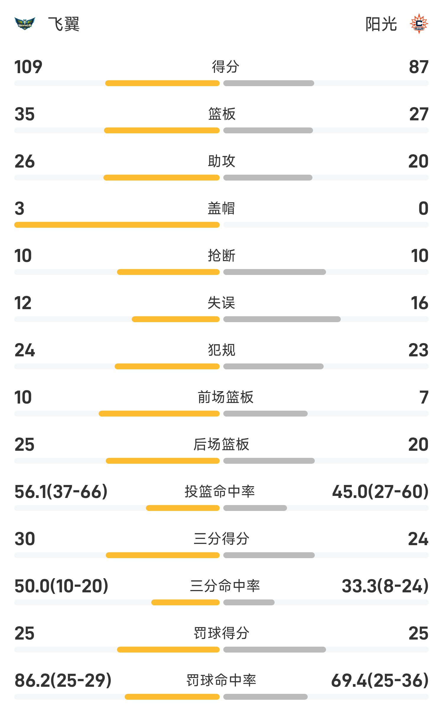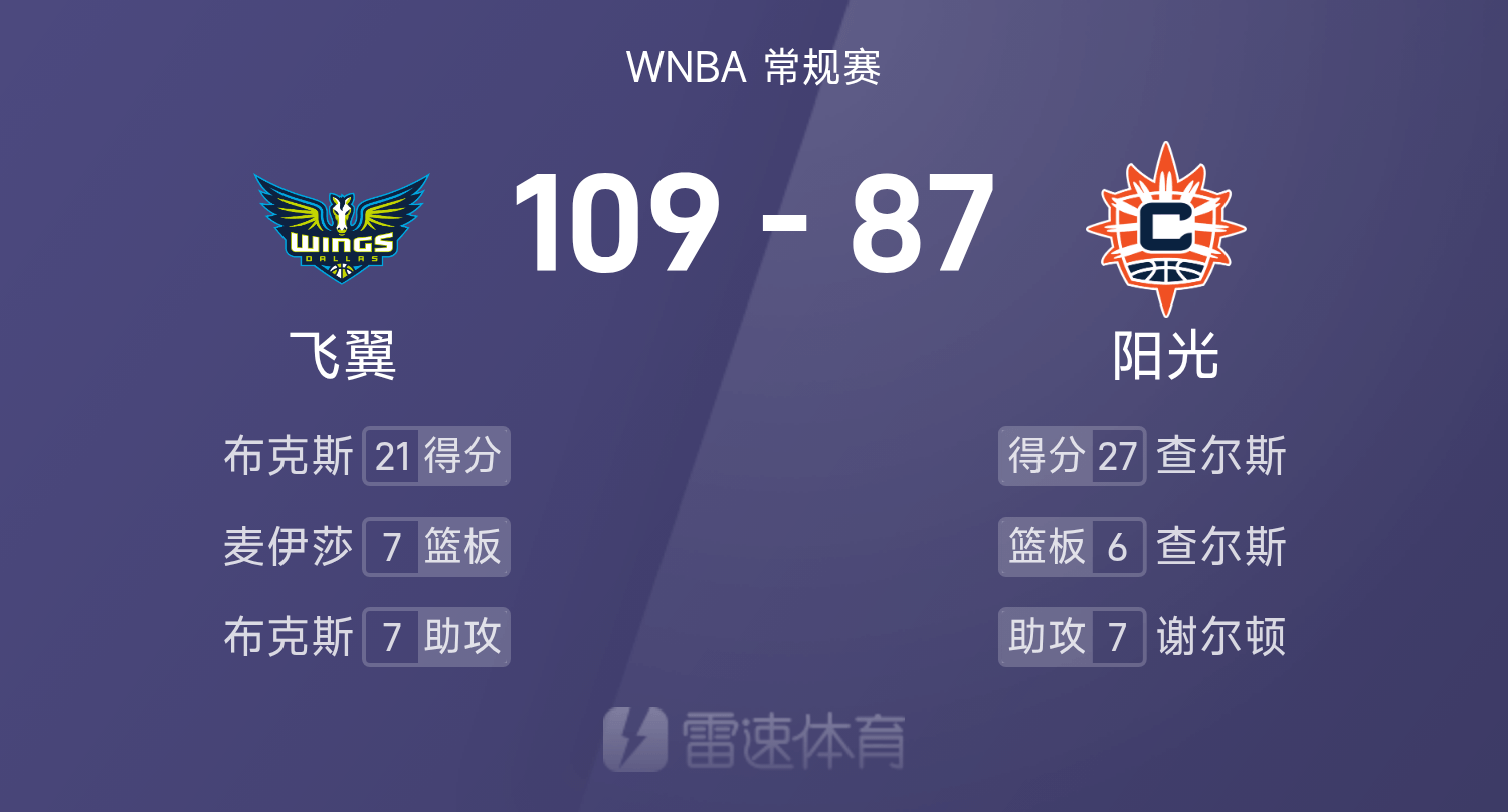 05月28日讯 25赛季WNBA 常规赛,阳光对阵飞翼。双方全场战罢,阳光87-109不敌飞翼。布克斯得到21分5板7助率队取胜,查尔斯空砍全场最高的27分6板3助。